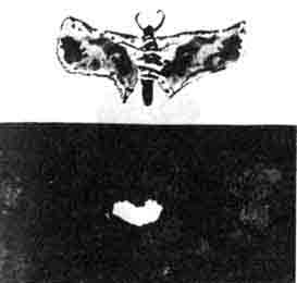 • 17 Henri Michaux, „Ohne Titel“, tachistische Fleckenmalerei. Tintenflecke oder Tuschflecke zeigen eine Suggestion vulkanischen Geschehens als Gesten seelischer Bewegung, die in den Flecken sichtbar werden. Ihr Wesen ist die Bewegung, ihre Erscheinung die Spur. Vorstellungen, bereits vorhandene Bilder, die durch mein Gedächtnis ziehen, werden dadadurch gezwungen unmittelbar zu erscheinen. Es muss etwas sein, das beim Betrachter sofort etwas erzeugt, das dessen innere Welten anspricht.